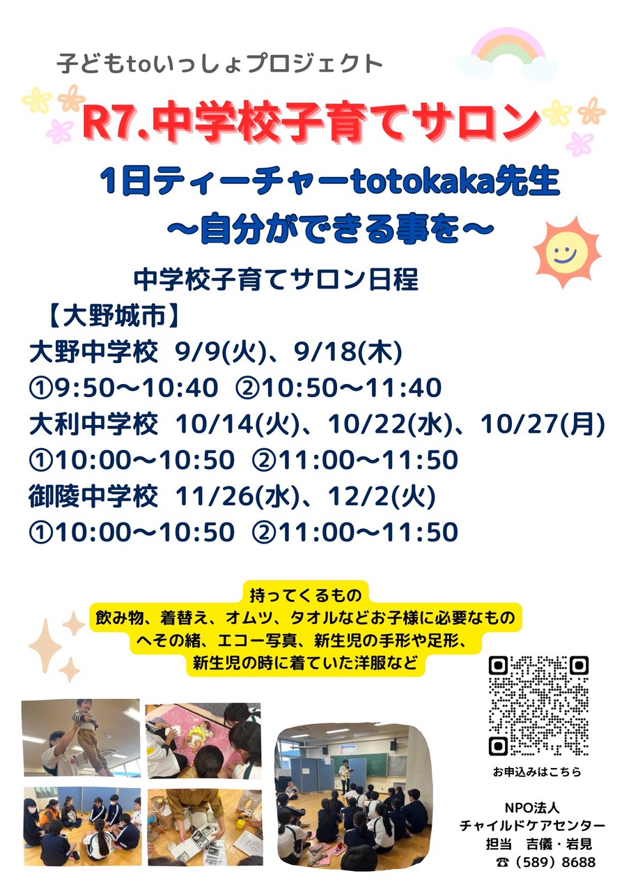 活動内容 | 子育て中の親子と中学生が触れ合う三世代交流と命の大切さを伝えることを目的とした中学校子育てサロン(命の授業)です。中学校のお兄ちゃん・お姉ちゃんと一緒に、親子で楽しい時間を過ごしませんか? ●開催日…2025年11月26日(水)・12月2日(火) ●時間…①10:00~10:50 ②11:00~11:50 ●必要なもの…飲み物、ミルク、着替え、おむつ、タオルなどお子様に必要なもの。また、へその緒、エコー写真、新生児の手形や足形、新生児の時に着ていた洋服など。 |